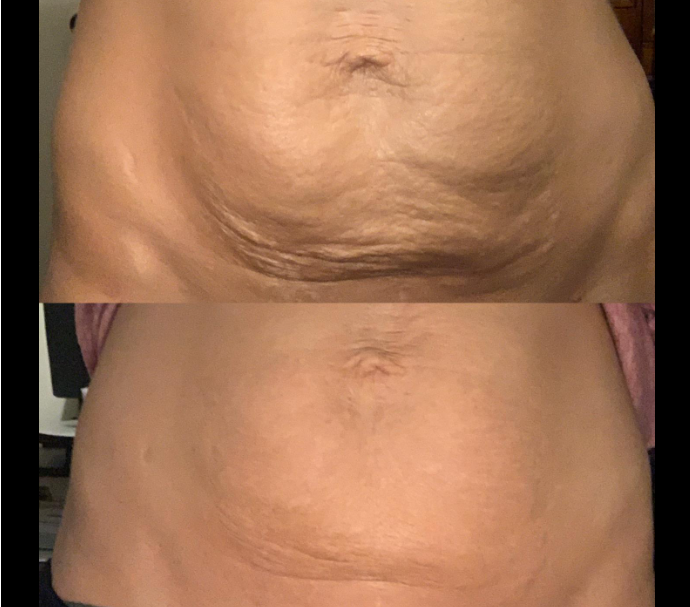 I am a twin mom and for all of us mothers out there let’s be honest our skin elasticity is never the same after bearing kids. I began using this product because I was searching for a skin tightening regimen and I stumbled across this item so I figured I’d try it out and the reviews were good. I ordered it and it arrived in a pump bottle and the pump part was broken so I’ve had to twist open the top each time I use it and it’s just a mess which is why I gave it 4 stars. The product itself is great however. On day 1 of using this product I took a picture. Exactly 1 month later after using this product once a day I took another picture. I have to say I am thoroughly impressed with how it actually works. The top photo is day 1 and the bottom photo is 1 month of using once a day. I was very skeptical at first but seeing the difference in these photos is proof that it does wonders. I would definitely recommend this product!